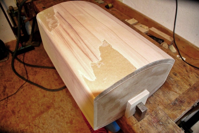 Die Probleme tauchten dann bei den größeren Boxen auf. Die kann man nach Verkleben der Front nicht gerade mal umdrehen. Das Ergebnis waren nicht richtig verklebte Stellen mit „Blasen“ unterm Furnier beim Center-Speaker. Ich habe das Furnier in Teilen wieder abgehobelt, mit Flüssigholz aufgefüllt und so eine erneute Furnierschicht vorbereitet.