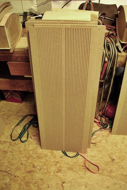 Letztlich war alles noch rettbar. Mit dem Bügeleisen auf einem alten Handtuch habe ich die Blasen in die Knie gezwungen und zumindest im „sichtbaren Bereich“ alles richten können. Der Rest war reine Freude. Löcher fräsen, dreimal wachsen, Weiche brutzeln und alles zusammen setzen. Ich hatte mich für je zwei Reflexrohre auf der Rückseite entschieden, was die Unterbringung der Dämmwolle (der Platz vor den Rohren soll ja immer frei bleiben) etwas erschwert. Aber hier siegt die Optik. Aus dem gleichen Grund habe ich das Terminal unter die Boxen verlegt.