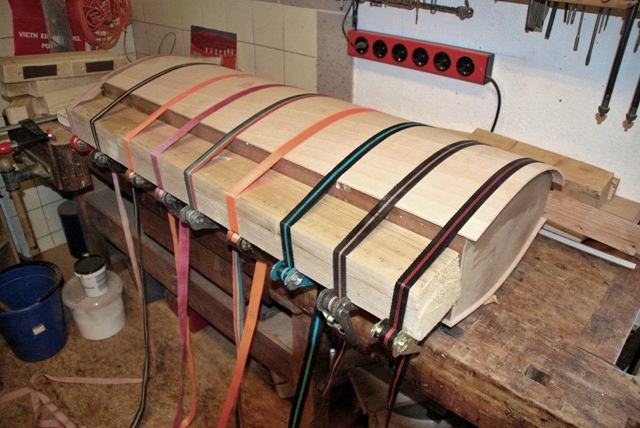 Die weiteren zwei Auflagen je Gehäuseseite haben meine Frau und ich mit selbst eingeschnittenen 8mm starken MDF-Platten beklebt. Da waren dann 20 Platten zu schneiden, in jede im 3mm-Abstand mit der Kreissäge Fugen zu ritzen und diese direkt vorm Kleben mit einer Sägespäne-Leimmischung auszufüllen. Anschließend haben wir Spanngurte gezurrt, bis der Arzt kommt. Bewährt haben sich die auf den Bildern zu sehenden Abstandhalter an der Front- und Rückseite, die den Zugwinkel der Spanngurte so verändern, dass die Ränder der Platten genau auf den Spannten aufliegen. Die Platten hatten wir so zugeschnitten, dass genug Überstand vorhanden war. Die Platten entdecken nämlich beim Aufkleben die Wanderlust und verschieben sich auf ihrer Leimschicht in jede ungewünschte Richtung. Die frisch eingeleimten Platten mussten mit der Blumensprühflasche angefeuchtet werden. Dann erfolgt mit viel Kraft und unter Einsatz einer Heißluftpistole der Widerspenstigen Zähmung solange, bis wir ohne Bruchgefahr die Gurte langsam anziehen konnten. Das alles unter einem gewissen Zeitdruck, da ja der Leim zu trocknen droht. Da lagen bei mir dann schon manchmal die Nerven blank, aber meine niemals verzagende Gattin behält auch in solchen Situationen noch den Überblick!