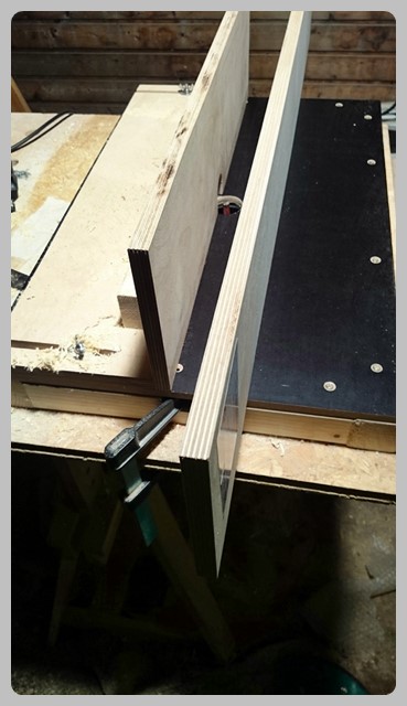 Das Holz traf wie immer schnell, zuverlässig und perfekt geschnitten ein und so machte ich mich bei zweistelligen Minusgraden an die Arbeit. Als Heizung fungierten zwei 500 Watt Baustrahler, die nebenbei auch noch etwas Licht spendeten. Mein selbstgebauter, mobiler Frästisch ist zwar äußerst simpel gestaltet und wahrlich keine Schönheit, aber um eine Nut in eine Brettkante zu bekommen für mich immer noch besser geeignet, als mit der Oberfräse auf der Längsseite einen Eiertanz zu vollführen.