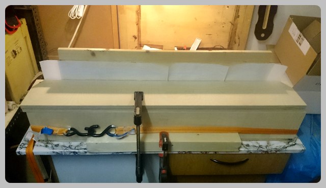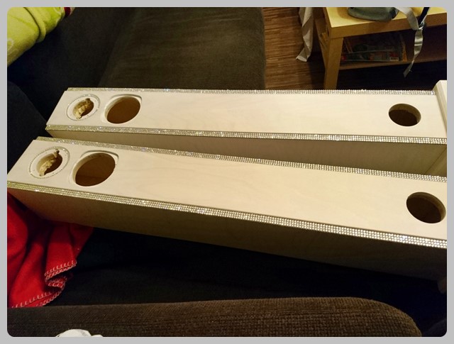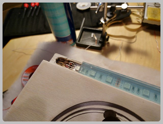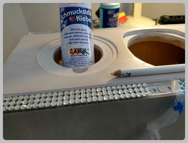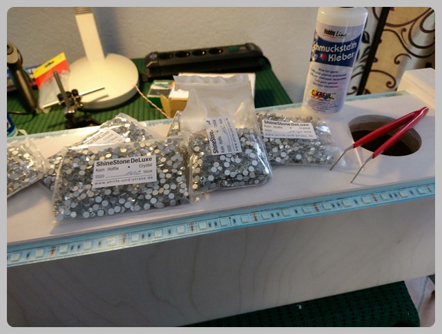 Nach den folgenden zwei Runden Dekorwachs weiß (seidenmatt) ging es an das Verbauen der LED Streifen. Diese passten hervorragend in die Nut und waren schell verlötet. Um die Beleuchtung abzudecken und eine plane Fläche zum Aufkleben der Strasssteine zu schaffen, fräste ich aus 3mm dickem Plexiglas Streifen von 15 mm Breite. Auf den Bildern erscheinen sie wegen der Schutzfolie noch blau.