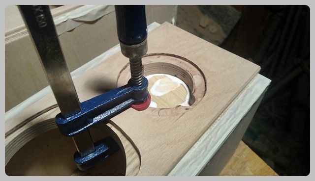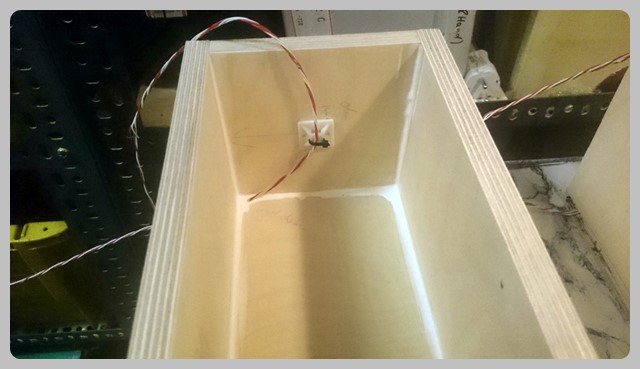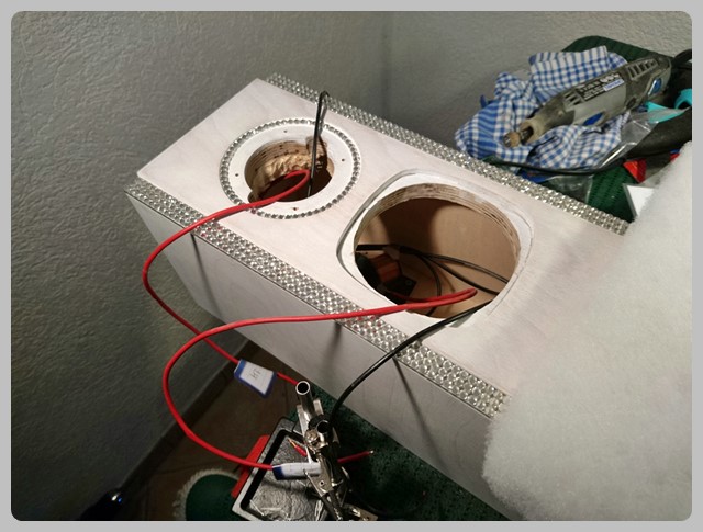 Und siehe da: Der bei jedem meiner Projekt obligatorische Verzweiflungsschrei hallte schon hier durch den Raum! „Aaaaaaargh!“ Offenbar waren mir nicht nur die Gliedmaßen, sondern auch das Gehirn eingefroren: Der Außenradius für den Hochtöner war ein Stück zu klein. Meine Versuche den Ausschnitt ein wenig größer zu schleifen scheiterten kläglich. Eine Lösung musste her: Um nochmals mit dem Fräszirkel Kreise ziehen zu können, klebte ich an der Innenseite des Gehäuses ein Brett ein. So hatte ich schnell einen neuen Mittelpunkt für den Dorn des Fräszirkels. Danach entfernte ich das „Hilfsbrett“, so gut es ging, mit dem Dremel. Ein Teil des Holzes verbleibt natürlich im Lautsprecher aber die Volumenänderung ist nur minimal.