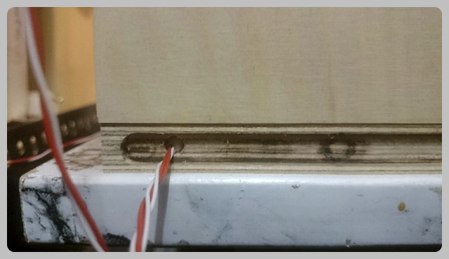 Die Chassisausschnitte der U_do 1 erlauben nur sehr grazilen Händen im fertig verleimten Gehäuse tätig zu werden. Vorsorglich verlegte ich also direkt „Stromkabel“ für die Beleuchtung – eine Extraportion Leim sorgt für Dichtigkeit.