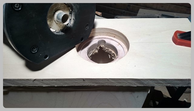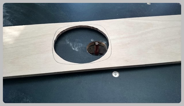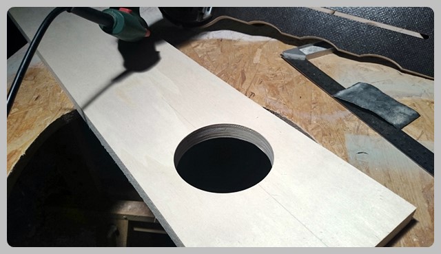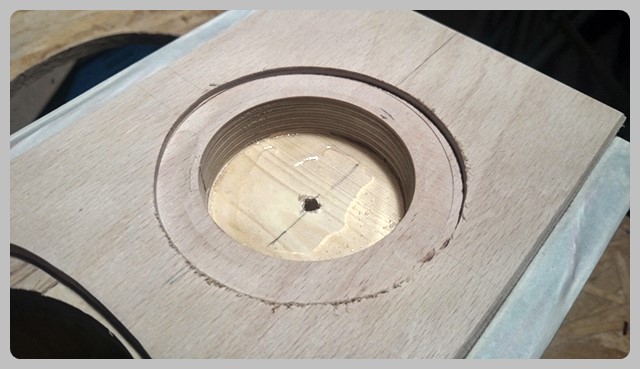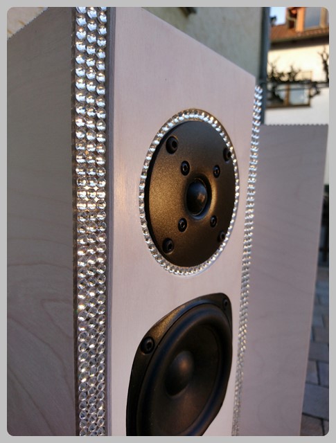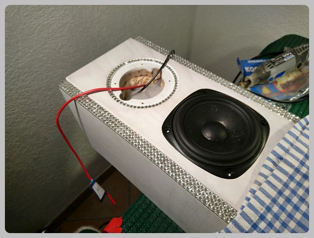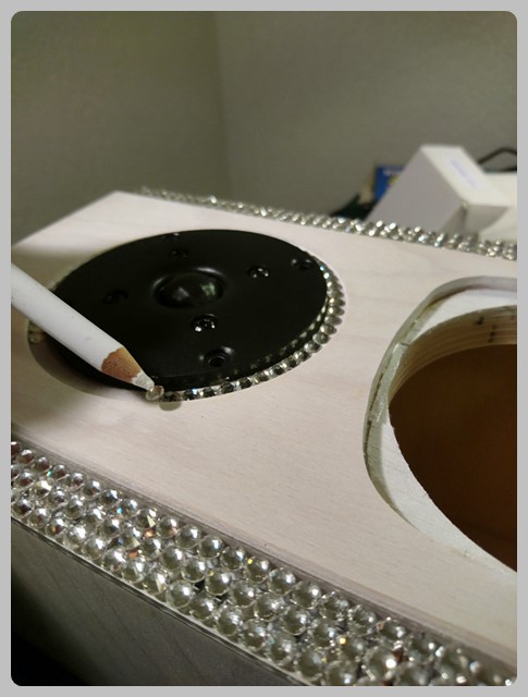Durch diesen kleinen Kunstgriff machte ich mein Missgeschick wett und hatte den perfekten Ausschnitt für einen Hochtontreiber. Dummerweise nur nicht für den, der bei diesem Bausatz zum Einsatz kommt. Kurzum – wieder falsch. Dieses Mal ein Stück zu groß. Das Fluchen hatte ich an dieser Stelle schon zugunsten eines herzhaften Lachanfalls eingestellt. Nachdem die (Lach)Tränen getrocknet und eine tröstende Hopfenkaltschale verzehrt war, ging es bei der Problemlösung in die zweite Runde. Ein Ring aus Strasssteinen der um den Hochtöner liegt, wäre doch bestimmt auch schön anzusehen oder?! So sollte es werden. Dazu musste der Ausschnitt jedoch nochmals vergrößert werden. Diesmal aber mit einem anderen Kniff. Um es kurz zu machen: Ich fräste ein Loch in ein Hilfsbrett, fixierte selbiges auf den Lautsprecher und fuhr mit der Oberfräse samt Kopierring einmal den Rand entlang und schon erschient im Holz die endgültige und korrekte Aussparung. Wenn man richtig rechnet, ist vieles leichter. Egal! Problem gelöst und weiter: