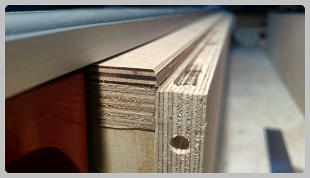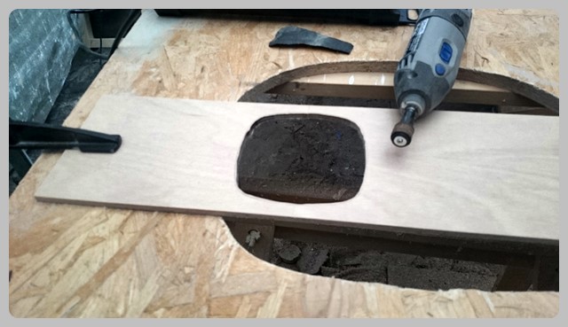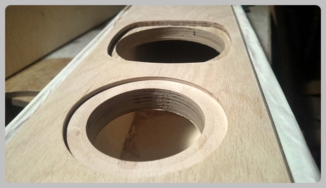 Das Spannendste an diesem Bau war sicherlich die ungewöhnliche Korbform der 4 Zoll SB 12PFC. Die Freude des Herstellers über die Materialersparnis bei der Produktion wandelt sich beim Versenken zu einer lustigen Bastelaufgabe – zumindest wenn man keine CNC Fräse sein Eigen nennt. Sicherlich wäre es eine gute Option gewesen, bei Udo gefräste Fronten mitzubestellen. Ich war mir aber beim Bestellen noch nicht sicher, wie hoch der „Glitzeraufbau“ (Strassteine + Plexiglas) am Rand werden würde und entschloss mich dazu ein Brett entsprechend der Höhe selbst zu fräsen/schleifen und aufzusetzen. Das nachträgliche Rechnen (3mm Plexiglas + 2mm Schmuckstein) ergab als geeigneten Kandidaten 6mm Buchen MPX. Dieses fand sich bei den Holzresten und wurde alsbald von mir wie folgt bearbeitet: