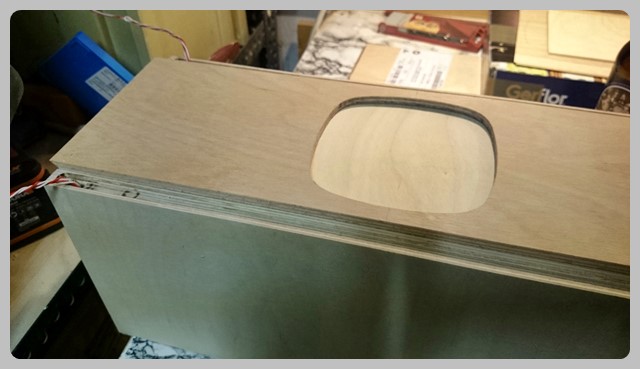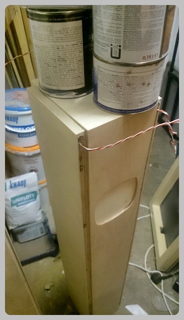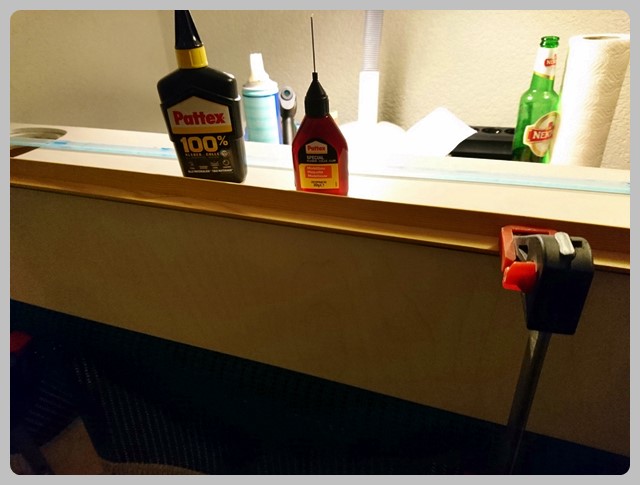 So hatte ich schnell meine aufgesetzte Front, in welche ich am oberen Rand noch eine 45 Grad Fase fräste. Für den Deckel (nur Strass – kein Plexiglas) schnitt ich mir noch ein Stück 3mm Birkensperrholz zurecht und verklebte alle Teile auf der Holzkiste. Durch die Gehrung war ich das leidige Thema „sichtbare Schnittkanten“ zum Glück gleich mit los – zumindest auf der Front. Die Optik der Rückseite ist mir persönlich ja regelmäßig egal – mal sehen, ob ich irgendwann mit dieser Tradition breche.