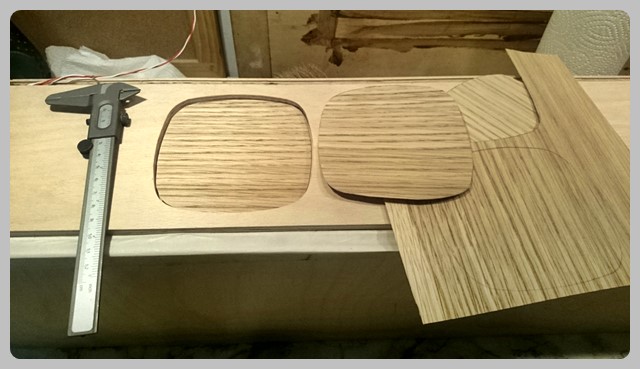 Jetzt mussten die Chassis in die Front versenkt werden. Leider ist zwischen 6mm MPX und 5mm Frästiefe für den Korb immer noch ein dummer Millimeter Differenz, um welchen das Chassis zu tief liegen würde. Klingt zwar wenig, aber da ich mir selbst Unmut über eine solche Kante prophezeite, fand ich schnell eine Lösung dafür: Das dünne Deckfurnier des Multiplex ließ leider keine Experimente beim Schleifen zu, so dass ich dem Chassis kurzerhand mit einer Lage herumliegendem Eichenfurnier zur richtigen Einbautiefe verhalf. Um am Rand den Übergang zur Strassdeko etwas gefälliger zu bekommen, fräste ich auch hier eine kleine Fase.