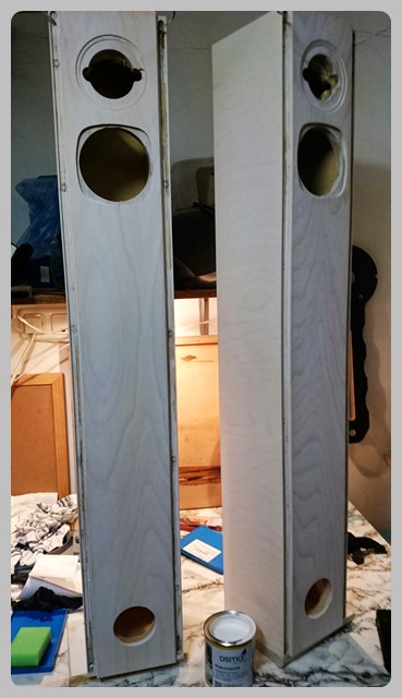 Als ich beim Hörevent in Eschborn zum ersten Mal die U_do 1 hörte, dachte ich sofort daran, dass dieser Bausatz ideal zu meiner Schwester passen würden. Obwohl sie Musik mag und ein ausgezeichnetes Ohr dafür hat, stehen bei ihr noch keine Lautsprecher, die diesen Namen verdient hätten. Ganz offensichtlich sind die U_dos bestenfalls vom Preis her Einsteigerklasse – das ACL Prinzip lässt regelmäßig Kinnladen nach unten klappen. Warum sollte es also nicht auch bei meiner Schwester funktionieren?! Damit sie den Geschenken nicht nur aus Höflichkeit Platz in ihrem Wohnraum zur Verfügung stellt, kreisten meine Gedanken nach der Holzbestellung schnell um das Finish. Wie treibt man den WAF auf ein Niveau bei dem eine Frau den Lautsprecher mag und gern behält? Ein „Blinker“-Faktor wäre schön – und eine Beleuchtung ebenfalls. Viel Wunschdenken – die weiße Farbe hingegen war einrichtungstechnisch schon gesetzt. Da ich mich von meiner erfolgreichen, aber nervenzehrenden Lackierarbeit im eigenen Heimkino noch nicht gänzlich erholt hatte, war es an der Zeit dem Multiplex mit weißem Osmo Dekorwachs an die Faser zu gehen. Nach einer Runde Grübelei war der grobe Plan fertig: