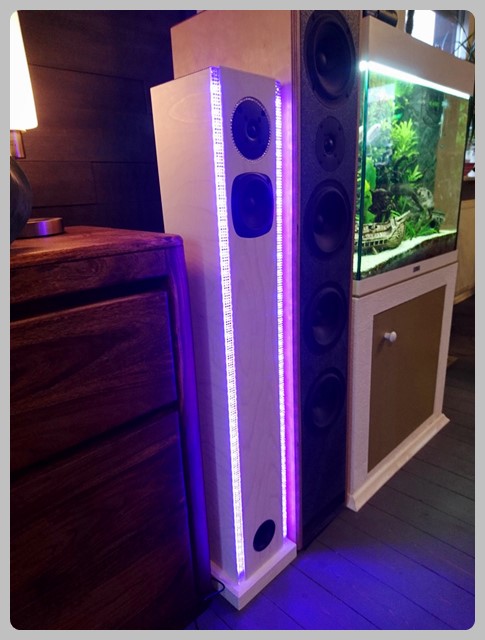 Als nächstes verklebte ich die Plexiglasstreifen und verbastelte die Elektronik für die Beleuchtung im Fuß der Lautsprecher. Schön geht zwar anders, aber sehen wird es im Idealfall sowieso niemand mehr. Also – was soll‘s?
