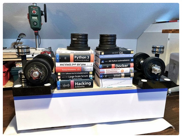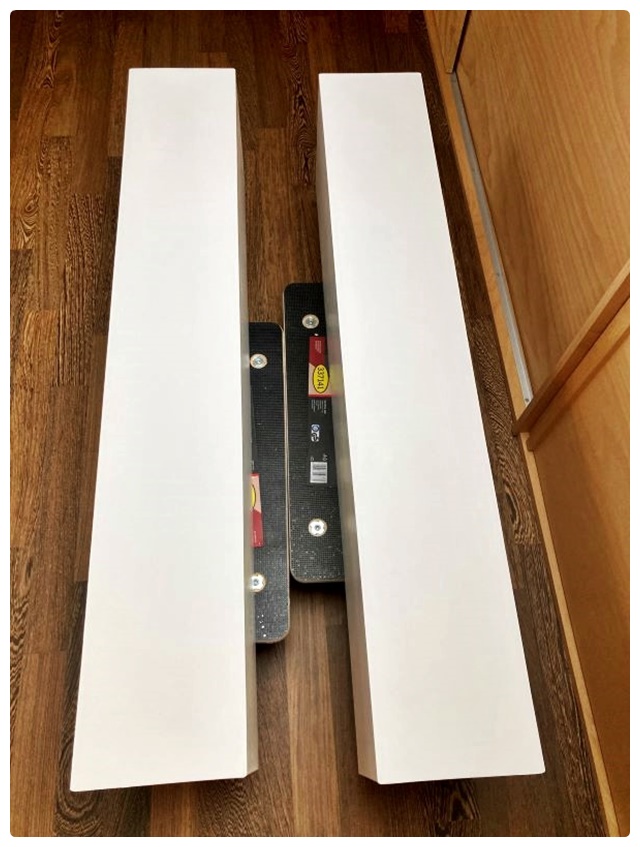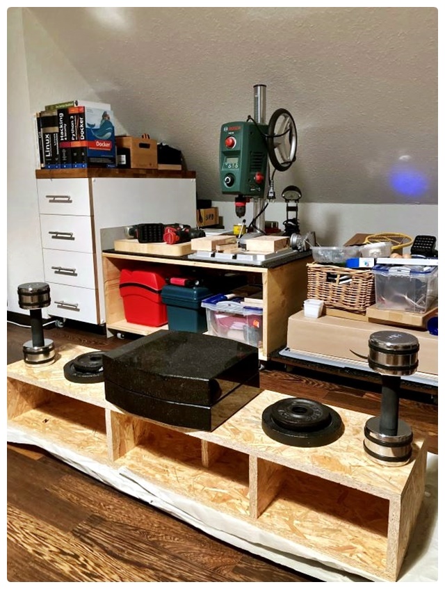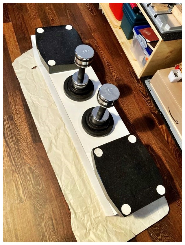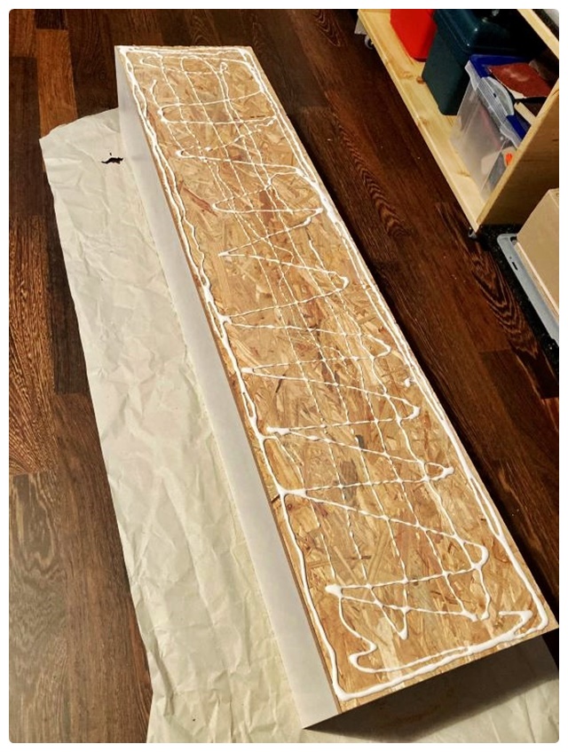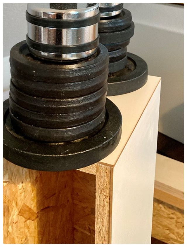 Ich habe mich offenbar kaum verrechnet. Beim Probeliegen der Teile zu Hause passte alles recht gut. Zunächst habe ich die Grundkörper aus den OSB-Brettern aufgebaut. Ich verwende selten Schraubzwingen, diese schaden nach meiner Erfahrung oft mehr, als sie nützen. Meist bringen ein paar schwere Gegenstände ein besseres Ergebnis. Beim Verleimen der OSB-Bretter ist nicht viel Druck erforderlich. Anders sieht es beim flächigen Aufbringen der HDF-Teile aus. Die von mir aufgelegten Gewichte waren dafür fast zu wenig. 6 – 8 volle Kästen Bier wären besser gewesen.