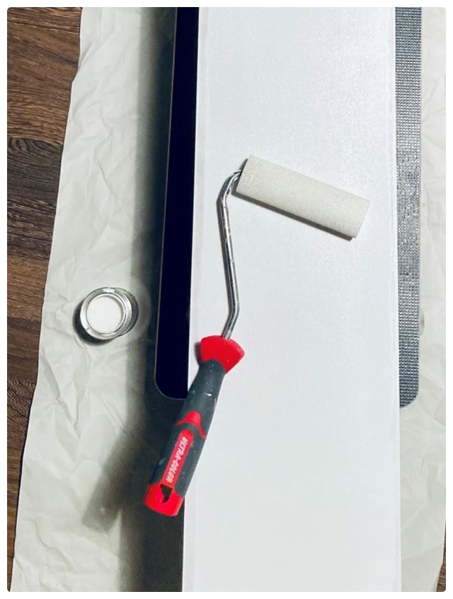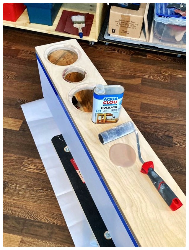 Nach 5 – 6 gerollten, weißen Lackschichten waren die Rücken wirklich ausreichend schön für Flächen, die man nur noch beim Umzug sehen würde. Die Multiplex-Fronten wurden geschliffen, weiß gebeizt, Schnellschliff-grundiert, feingeschliffen und mehrfach mit klarem Holzlack lackiert und durften dann schon mal Probe liegen. Durch das Beizen wird das Birkenholz nicht weiß, aber behält seinen hellen Ton und wird nicht so gelblich, wie beim Ölen und Wachsen oder Lackieren mit Bootslack oder ähnlichem.
