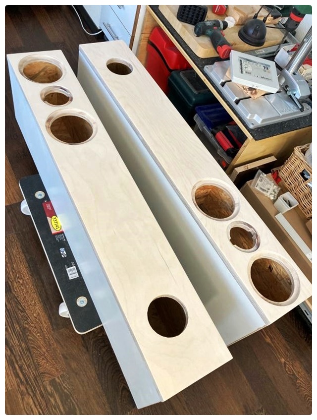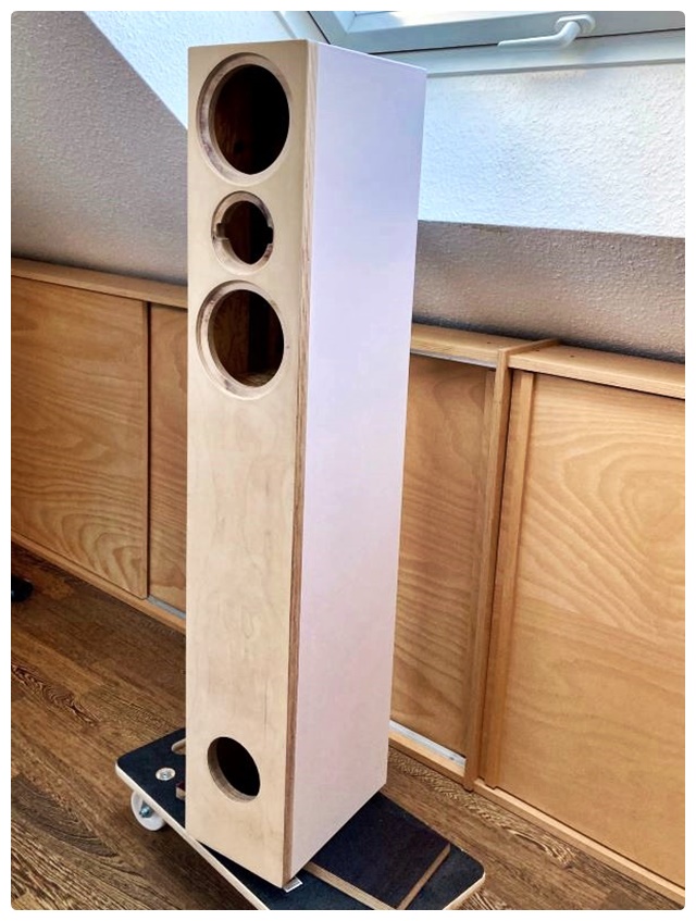 Nach dem Folieren und dem Einbau der Weichen konnten die vorbereiteten Fronten nun mit dem Korpus verleimt werden. Die Fronten von Udo hatte ich mit 2 mm Übermaß bestellt, die ich nach dem Verleimen bündig abfräsen wollte. Diese Zugabe war wohl etwas knapp. Toleranzen beim Zuschnitt im Baumarkt, Holzleim und 2 x Foliendicke hatten in Summe fast diese 2 mm. Das Verleimen wurde so ungewollt zur Präzisionsaufgabe, die aber gut gelang. Danach ging es mit dem Bündigfräser einmal rundherum, der nur noch an wenigen Stellen Material abtragen musste. Zusammen mit den Kanten der Fronten habe ich auch die Vorderflächen noch 3 – 4 Mal lackiert, dann war ich mit dem Ergebnis zufrieden. Nach dem Einstopfen des Dämmmaterials in die obere Kammer, Einpressen des BR-Rohres und Montieren von Chassis und Gummifüßen konnte die Erprobung starten.