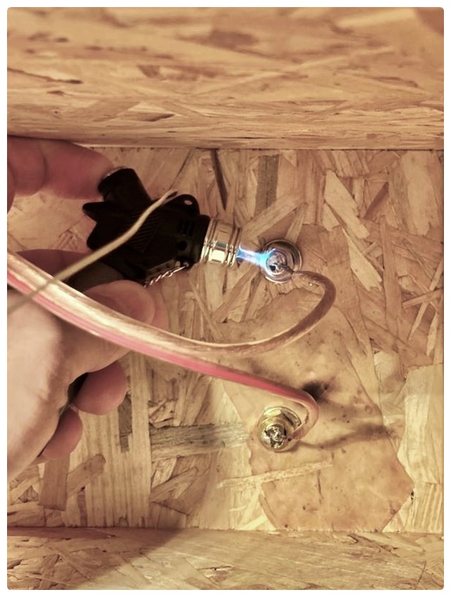Früher war nicht alles besser und manches sogar giftiger als heute. Trotzdem fließen meine Restposten an bleihaltigem Lötzinn wesentlich williger um die Kontaktpunkte als das gute neue, in dem sogar Silber drin ist. Mein Lötkolben ist aber auch kein Spitzengerät. Beim Verlöten der Kabel mit den Polklemmen war er machtlos und ich musste zu rabiaten Mitteln greifen. Mein Zigarrenfeuerzeug, welches eigentlich ein Mini-Crème-Brûlée-Brenner ist, habe ich kurzerhand als Lötlampe zweckentfremdet, was beim versehentlichen Auftreffen der Flamme auf das OSB-Holz den Raum mit schönen Röstaromen füllte.