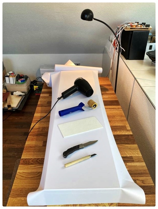 Das Folieren des Korpus ging erstaunlich gut und einfach. Wichtigste Voraussetzung ist eine absolut saubere Arbeitsumgebung. Jeder Mikrokrümel zwischen Untergrund und Folie zeichnet sich später sichtbar ab und lässt sich, im Gegensatz zum festgeklebten Insekt auf Lack, auch nicht mehr wegschleifen. Aus den OSB-Schnittkanten fallen immer wieder mal feine Späne. Ich habe daher gut Staub gesaugt und Werktisch und Boxenflächen mehrfach feucht abgewischt. Um die Folie eng an und um Kanten zu legen, leistet ein Haartrockner gute Dienste. Als Rakel zum blasenfreien Aufbringen der Folie diente mir ein Stück steifer Filz. Mit rasiermesserscharfen Schneidwerkzeugen kann man die Folie ohne Fransen oder Risse und fast in einem Zug an den Kanten entlang abschneiden.