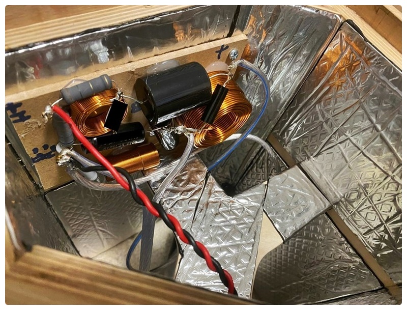 Innen kann man jetzt die Y-förmige Versteifung einleimen und das Ganze mit Alubutyl auskleiden. Ob notwendig oder nicht, darüber scheiden sich die Geister, der Klopftest war danach auf jeden Fall positiver. Die fertig gekaufte Weiche eingeschraubt (wer sich meine Lötstellen für die Polklemmen anschaut, der weiß, warum ich die Weiche aufgebaut gekauft habe). Und schon ist es Zeit für den Dämmstoff. Der ließ sich übrigens Dank abnehmbarem Deckel kinderleicht hineindrücken. Deckel und Boden noch flächig mit EPDM Zellkautschuk (alias Moosgummi) zur Abdichtung bekleben und samt Chassis ans bzw. ins Gehäuse schrauben.