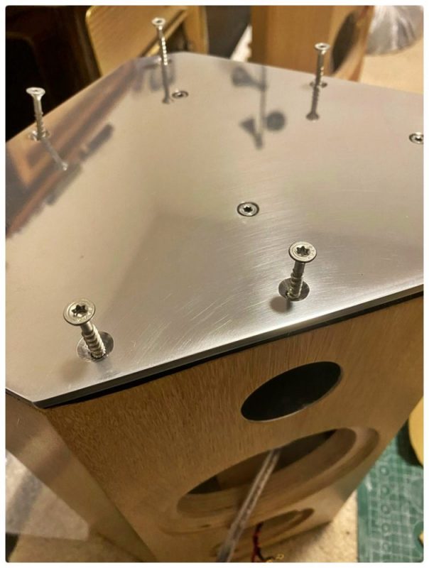 Wer richtig mitgezählt hat, wird bemerkt haben, dass Deckel und Boden fehlen. Da habe ich mir länger Gedanken gemacht, weil ich die Frequenzweiche nicht hinter dem Magneten des Tiefmitteltöners befestigen wollte. Da geht es schon sehr, sehr eng zu und am Boden stört das Bassreflexrohr. Ergo kommt für mich nur ein abnehmbarer Deckel und konsequenter Weise auch Boden in Betracht. Sicher hätte man die Weiche vor dem Verleimen des Gehäuses einbringen können, dann bekommt man sie aber fast nicht mehr heraus, falls doch mal was kaputt geht.