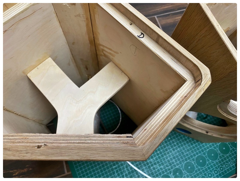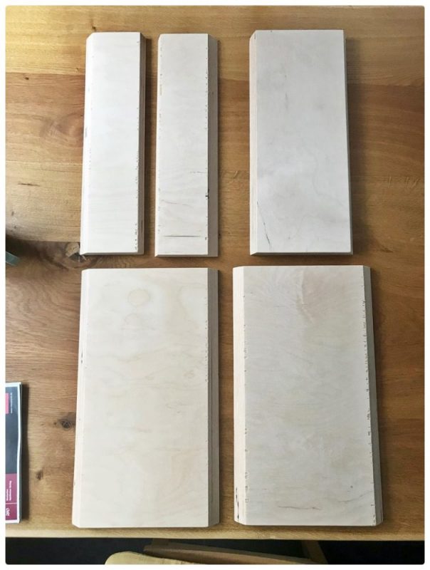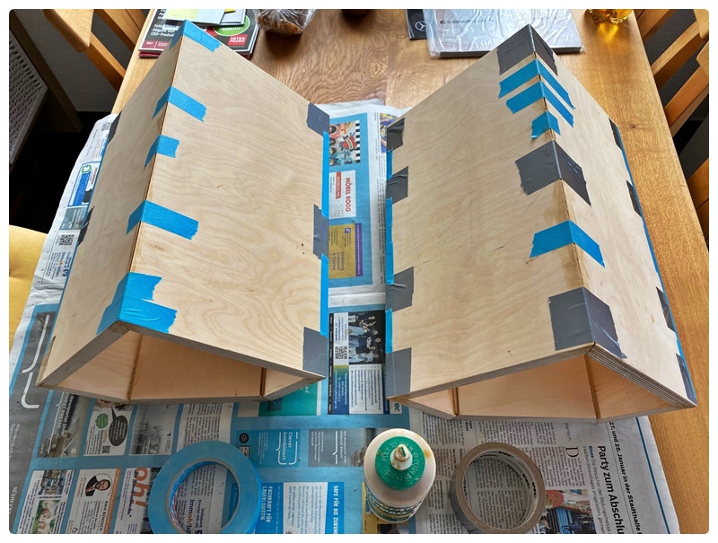 Zehn Brettchen in 18 mm Multiplex Birke mit einer Fase von 45 bzw. 22,5 Grad sind auf der Kreissäge schnell gemacht. Ich hatte auch noch 21 mm MPX Reststücke die gerade so für die Fronten reichten. Ohnehin kamen mir die 18 mm beim ersten Zusammensetzen mit Klebeband nicht sehr stabil vor und war froh um die 21 mm an der Front. Das Gefühl kam aber sicher auch daher, dass ich zuvor wochenlang Eichenbohlen in 20 bis 30 mm verarbeitet hatte. Der Blick zum späteren Aufstellungsort zeigt, dass die Größe gut passen wird.