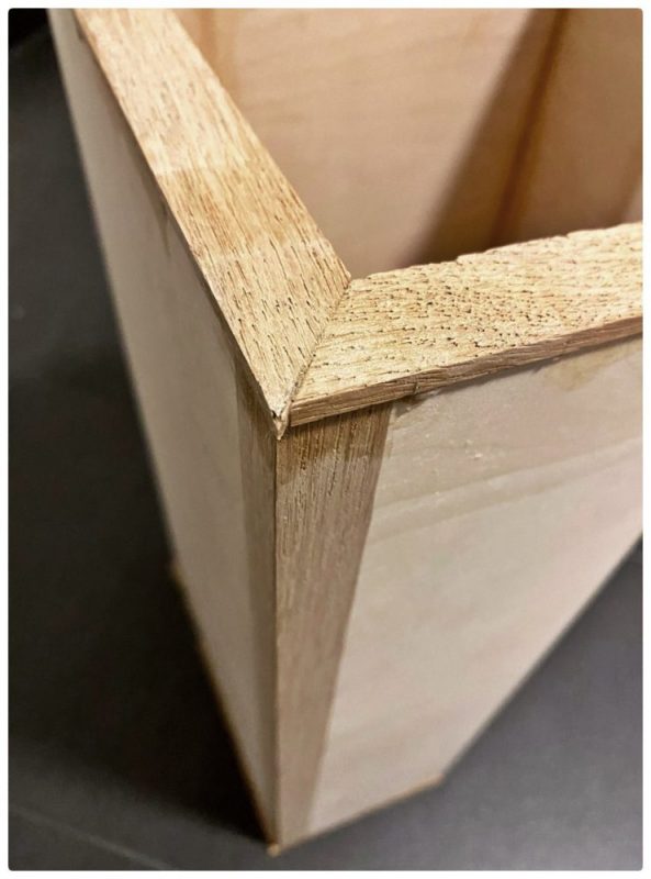 Nun ging es flott ans Verleimen und das Anfasen der Kanten. An die Kanten (90 Grad und kleiner) leime ich grundsätzlich Massivholz, um nach dem Furnieren leichte Rundungen anschleifen zu können und wenn man mal dranstößt, blickt man auch nicht gleich auf die Birke.