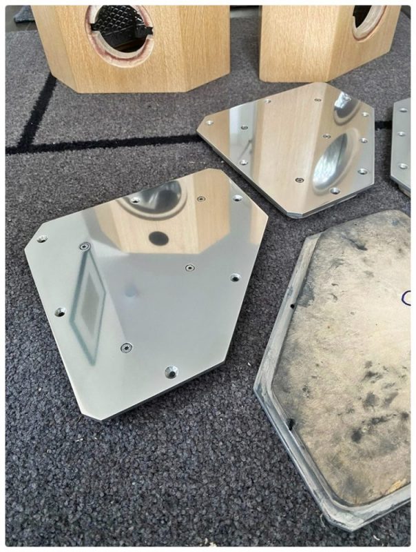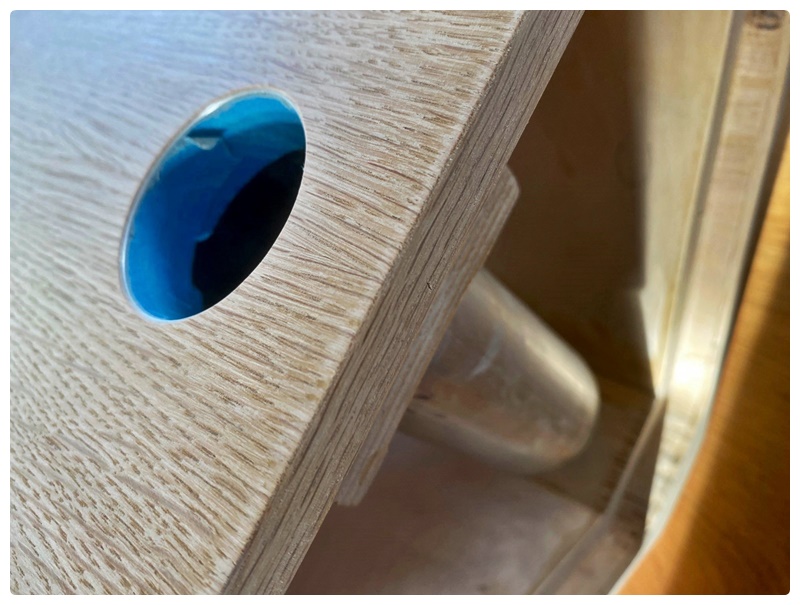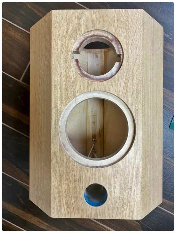 Wie? Jetzt schon? Ja, ich trage Wachs oder Öl immer gerne auf, bevor ich fräse. Da die Fasern verfestigt werden, hat man deutlich weniger Ausriss. Gerade bei offenporigen Hölzern wie der Eiche. Das Einstellen des Fräszirkels hat dieses Mal länger gedauert, bis ich nach mehreren Tests die perfekten Durchmesser für Hoch- und Tiefmitteltöner gefunden hatte. Das Ziel war, die Chassis quasi übergangslos in die Box einzupassen. Nach dem Fräsen dann noch zwei Mal schmirgeln und wachsen und schon sieht´s außen fast nach einem Lautsprecher aus.