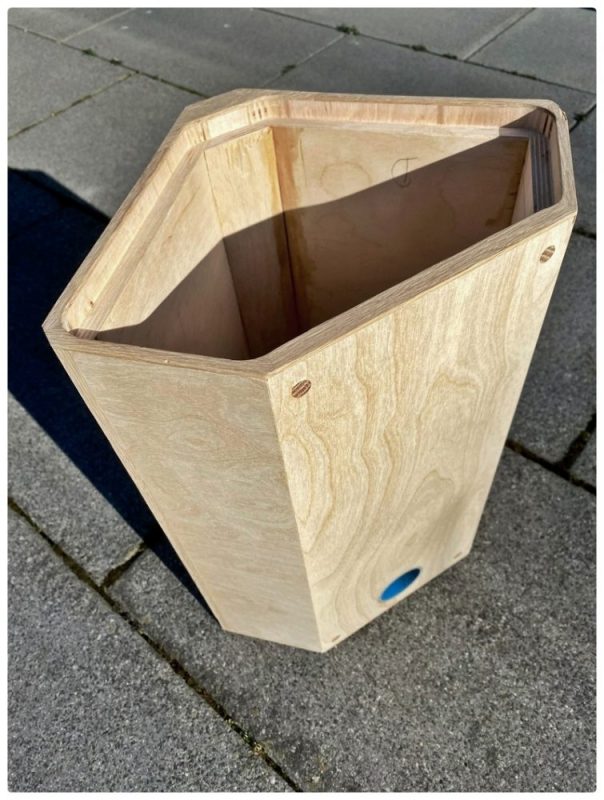 Fix im gleichen Atemzug das Bassreflexrohr mit Epoxidkleber eingesetzt, nach dem Aushärten an der Kante zur Front plangeschliffen und schon geht es ans Furnieren. Durch die diamantene Form der Box ging das meist nur schräg zum Tisch, hat am Ende des Tages mit der Bügelmethode trotzdem gut geklappt, auch wenn mir das angewinkelte Arbeiten am nächsten Tag einen leichten Muskelkater beschert hatte. Nun die Überstände abschneiden und die Flächen mit 240er Papier anschleifen, um eine erste Schicht Flüssigwachs aufzutragen.