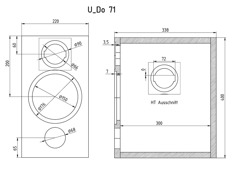 Oh, da hab ich mich ein wenig vergalloppiert, zurück zum Thema. Wie sicher den meisten Lesern längst aufgefallen ist, habe ich keine Probleme mit neuen Zeiten. Wer nur gelten lässt, was ihm altbekannt ist, lebt rückwärts gewandt und sein „Damals war alles besser!“ nimmt ihm den Blick auf die grandiosen, technischen Neuerungen, die gerade in den letzten Jahren früher teures Großes in bezahlbares Kleines transformiert haben. Ich rede hier natürlich auch von der Entwicklung bei der Musikwiedergabe, wo seit einiger Zeit der Turm aus vielen Einzelgeräten durch einen kleinformatigen Alleskönner verdrängt wird. Ja, wer wirklich hohe Ansprüche an beste Musikalität legt, wird noch seine alten Platten oder CDs nutzen, die nicht in die All-in-ones gesteckt werden können. Das wurde eingetauscht gegen die Bequemlichkeit des Streamens, das uns grenzenlos durch die gesamte Musikwelt wandeln lässt. Seit einem halben Jahr sind auch wir dank der Arylic-Amps fleißig dabei, dies platzsparend und kostengünstig in alle Räume zu übertragen. Nun ist also wunschgemäß die U_Do 71 BR an der Reihe. Damit der Aufbau des Chassis-Domizils klappt, habe ich eine Zeichnung mit Freecad angefertigt, die selbstverständlich für die eigenen Bedürfnisse umgemodelt werden darf.