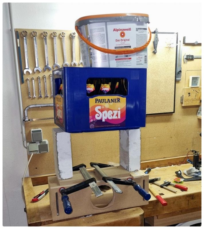 Egal, sollten ja nur fürs Gartenhaus sein und heute Abend schon Probe gehört werden. Irgendwie habe ich das mit meiner Bosch korrigiert, auf ein halbes Schnapsglas wird es beim Volumen nicht ankommen. Das Verleimen verlief dank verschiedener Hilfsmittel relativ problemlos, wenn auch zirkusreif.