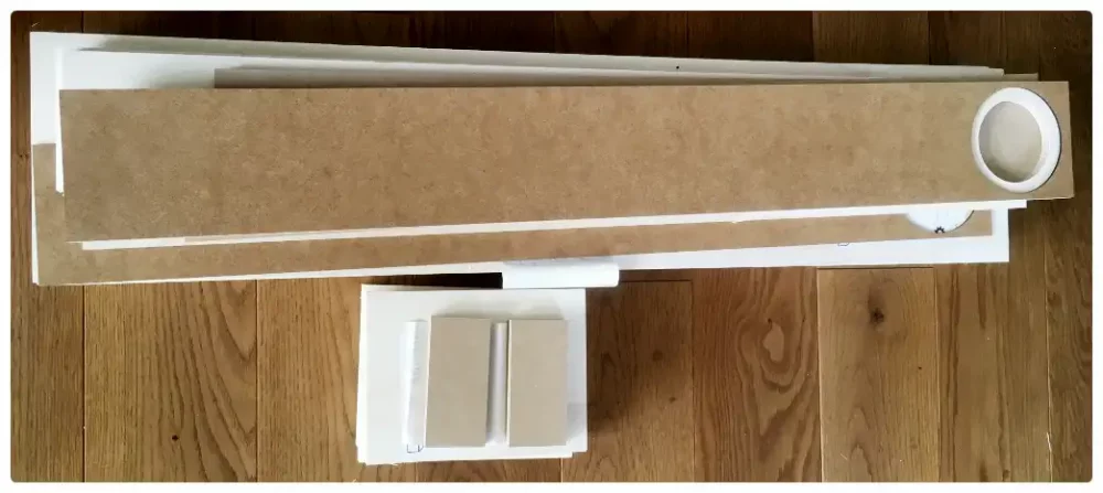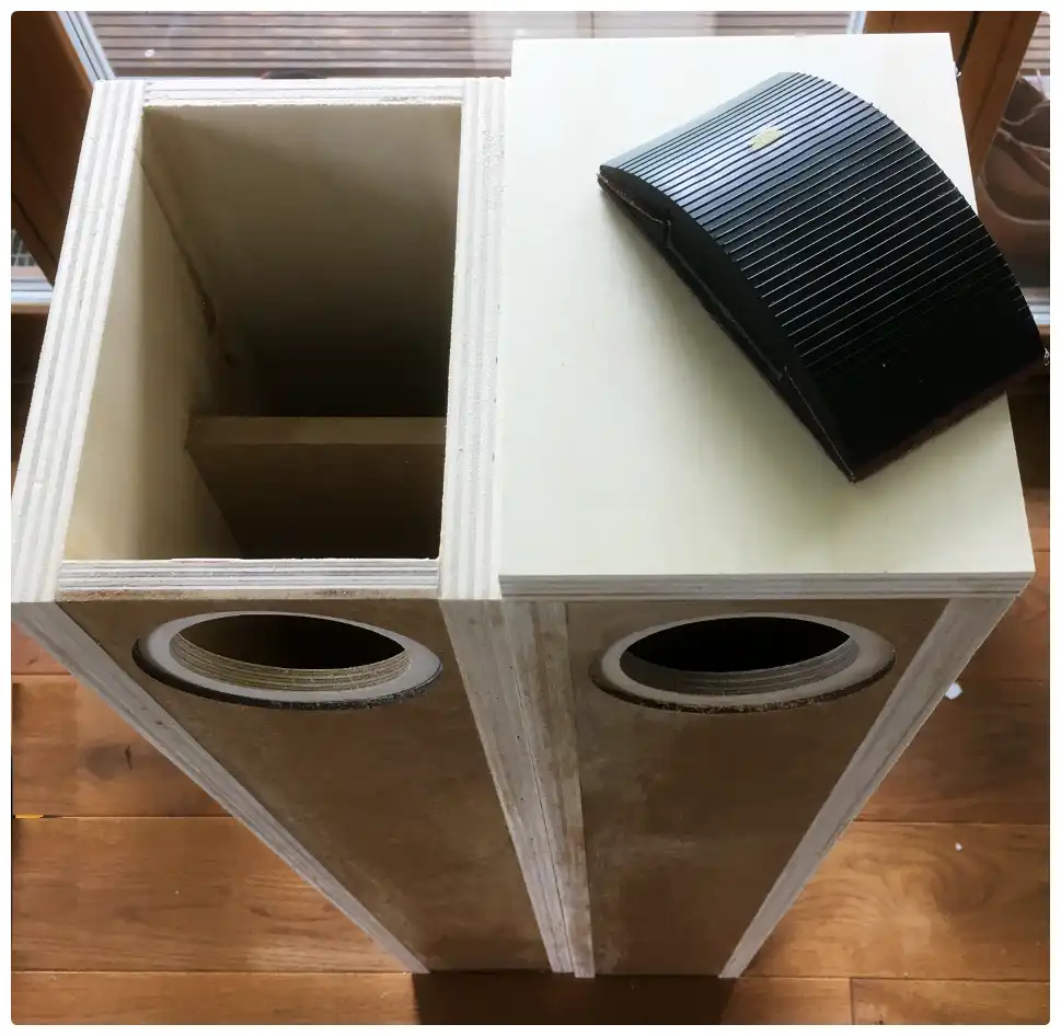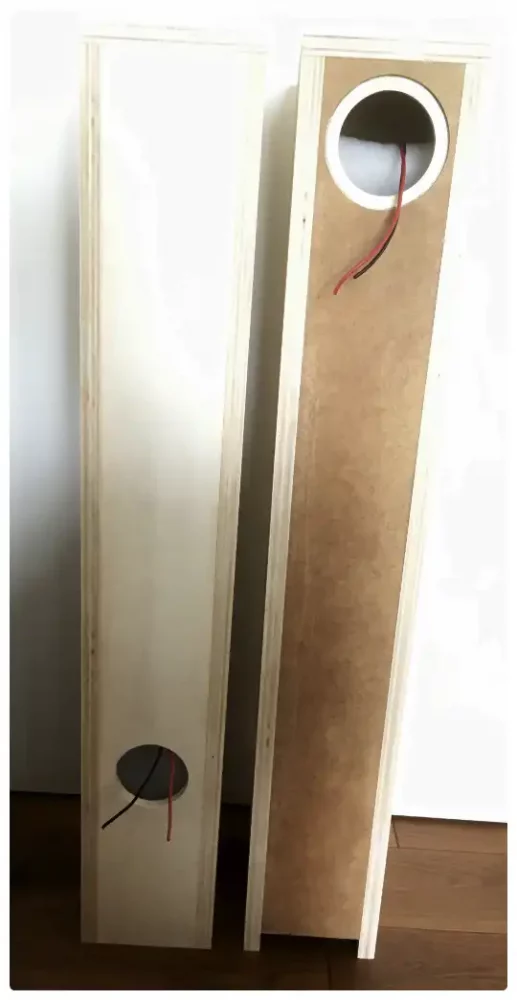 Da ich letztes Jahr im Sommer noch keine Oberfräse hatte, dachte ich mir, die Chassisvertiefung mit einer 3mm HDF Platte auf 9 mm Birke Multiplex zu realisieren und beide Platten mit Holzleim zu verkleben. Die restliche Holzkonstruktion basiert auf den Standardmaßen nach Plan. Einen Mix von verschiedenen Holzarten habe ich gewagt. 12 mm MDF für die Pipe und für die Rückwand 12mm Pappelmultiplex. Für Deckel, Boden und Seiten gab es 18mm Pappelmultiplex. Alles im Juni 2020 online bestellt. Alles wurde auf den Millimeter genau zugeschnitten. Los ging es mit dem Bau, nachdem das fertige Holz geliefert wurde.