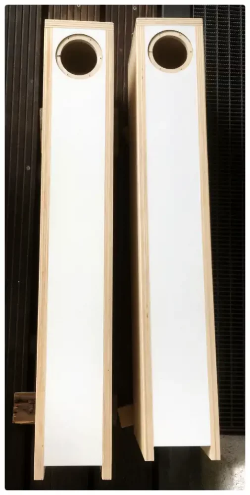 Front ist geweißt, aber ein paar Farbreste müssen noch entfernt werden. Die Bodenplatten habe ich je Box mit 4 Schrauben fixiert. Ich dachte zu dem Zeitpunkt, dass ich die Kippstabilität berücksichtigen sollte und falls nötig auch mal andere, breitere Bodenplatten montieren könnte. Kanten, 120er Schleifpapier – eine leichte Fase mit dem Handschleifblock, bei Pappelmultiplex ist das nicht so schwer. Finish: Drei Schichten Umwelt freundlichen Acryl Klarlack aufgerollt – das Sommerwetter beschleunigte das Trocknen im Freien rasant.