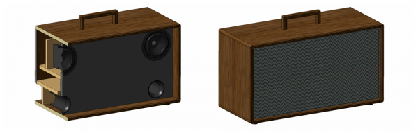 Bei der Bauplanung habe ich mich ausgehend von der von Udo gezeichneten Form an mein finales Design angenähert. Da ich beide Lautsprecher optisch in „einem“ Gehäuse unterbringen wollte, streckte ich das Volumen eher in die Breite und erhielt für meine Geschmack eine gefällige Form der Gesamtkonstruktion. Es sollte ein bisschen an ein altes Radio oder eine retro-Gitarrenbox erinnern.