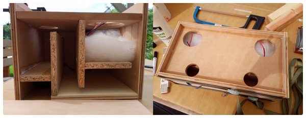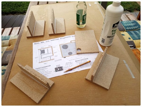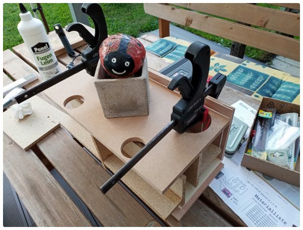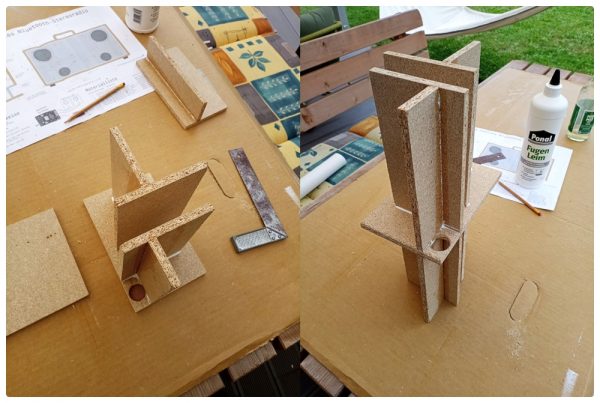 In den kommenden Tagen entstand in angenehmer Feierabendarbeit bei schönem Wetter zunächst das innenliegende Konstrukt aus den Kammerteilern. Dabei hätte ich mir ab und an ein weiteres Paar Hände gewünscht. Mit etwas Übung gelang es dann aber doch, alle Platten an der richtigen Stelle zu verkleben. Da ich zu einem späteren Zeitpunkt nicht mehr richtig darangekommen wäre, habe ich hier nun schon die Lautsprecherkabel und einen Straps zum Halten des Akkus montiert.