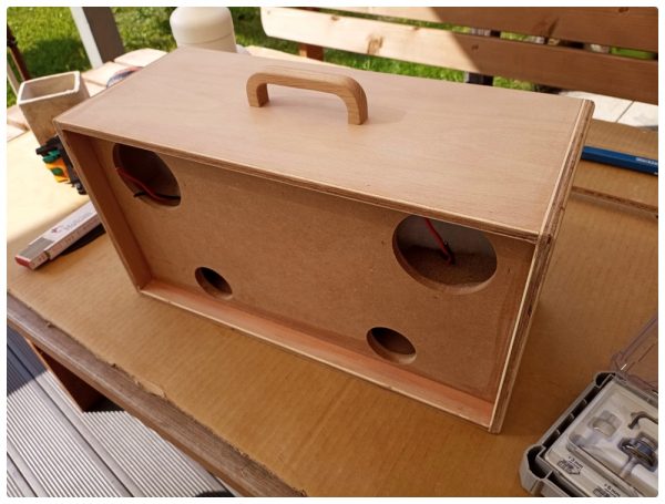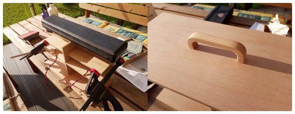 Bevor die Schallwand an ihre vorgesehene Stelle verklebt werden konnte, habe ich zuerst die Rückwand, den Deckel und das Innenleben miteinander verklebt. Der Deckel erhielt dann noch einen Holzgriff – den hätte ich später nur mit sehr spitzen Fingern montieren können. Zum Beschweren nutzte ich neben den Zwingen alles, was gerade greifbar war.