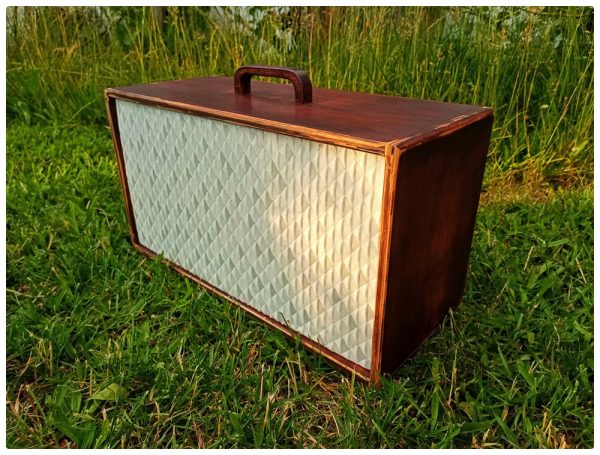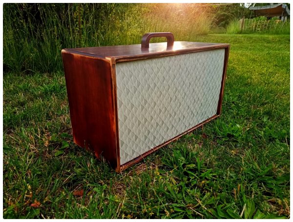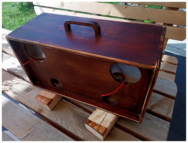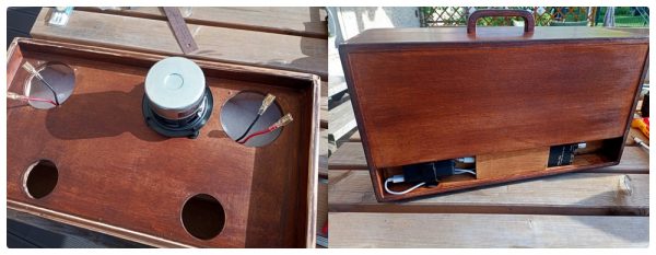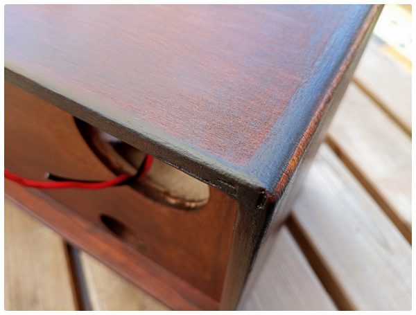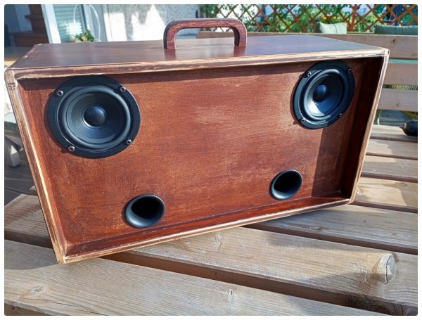 Der sich daraus ergebende „used“-Look gefällt mir ausgesprochen gut und erweckt den Eindruck einer gewissen Patina. Mehr Retro geht ja wohl nicht. Damit das Ganze trotzdem hübsch bleibt, habe ich die Flächen noch mit rötlich-brauner Möbelpolitur behandelt (die hatten wir noch da). So kann es bleiben. Die Montage der Lautsprecher und Bassreflexrohre war dann schnell erledigt und ich konnte es kaum erwarten zu hören wie das Ganze denn so klingt. Also noch den Stereo-bluetooth Verstärker und die Spannungsversorgung an den dafür vorgesehenen Plätzen montieren und es kann los gehen.