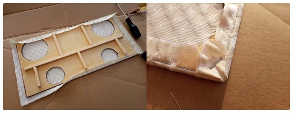 Nachdem ich den passenden Stoffteil aus dem Bezug extrahiert hatte, wurde dieser gewissenhaft auf das vorbereitete Schallwandbrett umgeschlagen und festgetackert. Die Überstände habe ich abgeschnitten und die Ecken ordentlich vertackert.