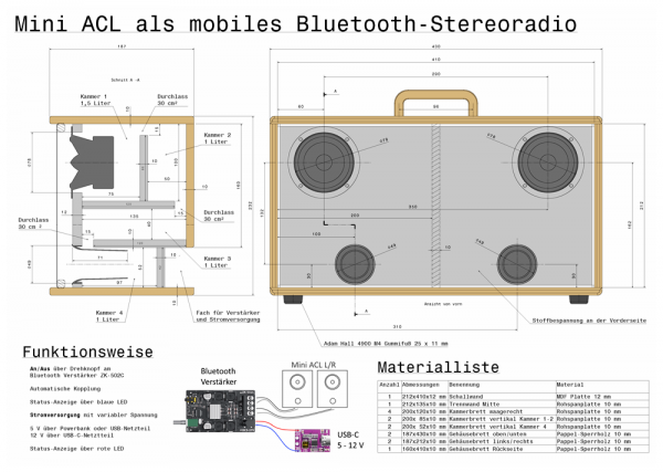 Also frisch ans Werk, um einmal Udos Website zu durchforsten. Lange musste ich nicht suchen, es galt jedoch eine Entscheidung zu treffen. ACL oder SUB-Unterstützung buhlten hier um die Gunst der Ohren. Aufgrund der klanglichen Erfahrung mit der U_Do 41 ACL und dem Wunsch so klein wie möglich zu bauen gewann hier das ACL-Prinzip. Und weil hier „klein“ schon im Namen steht, fiel die Wahl auf die MINI ACL. Außerdem verspreche ich mir von einem Stereo-Verstärker (China-Kracher) eine längere Spieldauer am USB-Akku als von einem 2.1-Verstärker (auch China-Kracher). Schließlich muss hier nicht noch der SUB mit WATT gefüttert werden.