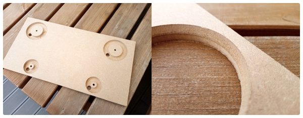 Nun war es an der Zeit, die Schallwand vorzubereiten. Damit die Schrauben für die Lautsprecherchassis genug Halt finden, habe ich hier 12 mm MDF verwendet – im Gegensatz zum 10 mm starken Material des restlichen Gehäuses. Die Ausschnitte habe ich mit einem Fräszirkel und meiner Kantenfräse gemacht. Das funktioniert sehr gut. Dabei gehe ich wie folgt vor: zuerst wird penibel angezeichnet und ein Loch gebohrt für den Fräszirkel; danach bohre ich ein Loch mit Durchmesser 13 mm (sodass mein Bündigfräser durch passt) möglichst eng an der Kreisaußenkante; danach werden die Kreisausschnitte gefräst sodass noch ca. 2 mm Material übrig bleibt; am Schluss werden die Kreise mit dem Bündigfräser von der Rückseite aus freigelegt. Auch wenn es klanglich keine nennenswerte Auswirkung hat, habe ich den Chassis von hinten noch eine Fase zum freien Atmen gegönnt. Kantenfräsen macht einfach zu viel Spaß.