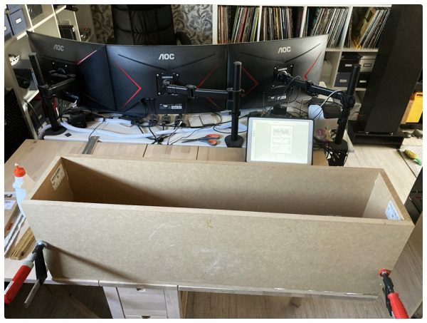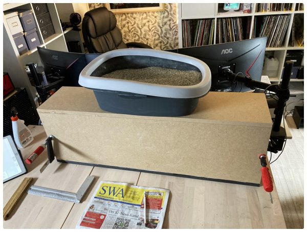 Die Fronten hatte ich schon bei Udo in schwarz durchgefärbtem MDF, anfertigen lassen, das restliche MDF, im präzisen Zuschnitt, bei Expresszuschnitt.de bestellt. Der Zusammenbau ging flott. Leider waren die meisten meiner Schraubzwingen verliehen. Wie es immer so ist. Also improvisieren.