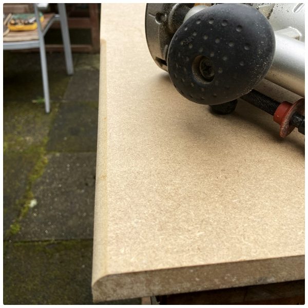 Irgendwann die kleine Makita angeworfen und mich gefreut, dass der passende Fräser noch sauber justiert im Futter war. Dennoch, ein Opferbrett ist hier Pflicht – stell dir vor man versaubeutelt jetzt noch die Fronten…