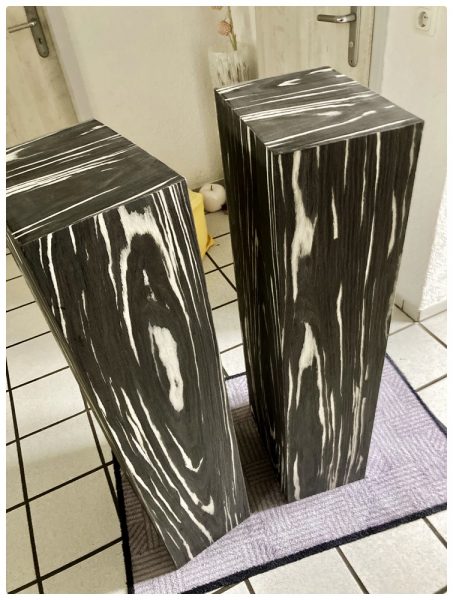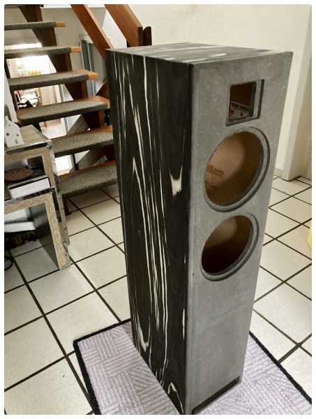 Mangels einer Sisal-Bürste oder ähnlichem Polierwerkzeug (war am Ort auch nicht zu bekommen), habe ich mich, entgegen guten Ratschlägen, entschlossen, einen Tag später nochmals da ranzugehen und mit 1200er Schleifpapier alles anzuschleifen, das Wachs nochmals dünn aufzutragen und weiter mit der Maschine und vorhandenem Equipment aufzupolieren. Am Ende war das Ergebnis etwa seidenmatt glänzend. Das reichte mir dann bei dem dunklen Furnier auch vollkommen. Ich werde aber, wenn das Wachs endgültig ausgehärtet ist, mit Möbelpolitur noch einmal an die Gehäuse gehen. Gerade bei schwarz durchgefärbten MDF hat sich das bei mir an zwei anderen Projekten bewährt. Versuch macht klug, sagt man ja.