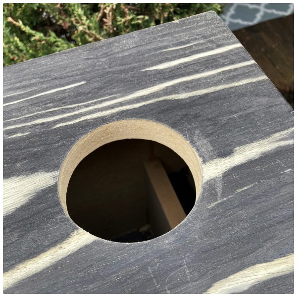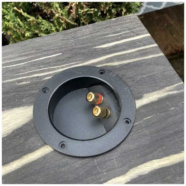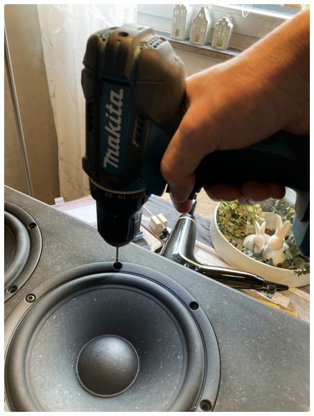 Weiter ging’s. Ich hatte für die Terminals versenkbare Buchsen bestellt, die natürlich nicht herbeikamen. Sie kamen dann drei Tage nach Fertigstellung der Doppel 9er. Also das Loch für die mitgelieferten Terminals nachträglich mit dem Kreisschneider ins Furnier gesägt.