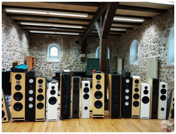 Nach freudiger Begrüßung schleppten alte und neue Freunde die Kisten und Kästen an die vorbestimmten Plätze, wobei wir diesmal die Kapelle als Vorführraum ausließen. Mittags hatten wir etwa 30 Boxenpaare in vergleichbare Einheiten aufgeteilt. Die Kleinboxen teilten sich einen langen Flur mit den schmalen ACL’s, weiter hinten spielten Rincewinds Rundstrahler im Wechsel mit.