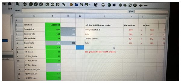 Die “Schräge” bei den PMC Boxen hat mir immer gut gefallen und da ich 95% der Hörzeit auf dem Sofa liege, darf die Höhe ruhig unter einem Meter liegen. Also die SB 12 bestellt und gleich mal die Dimension im FreeCad geändert. Ich will eine Höhe von 800 mm bei gleichbleibender Front von 160 mm ergibt laut FreeCad 210mm Tiefe.
