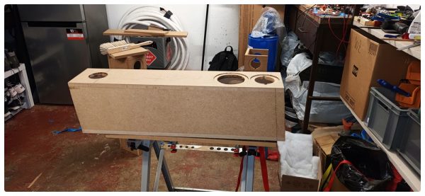 Jetzt noch das ganze 5° schräg. Ähm ja, wie mach ich das eigentlich? Hier fingen die Probleme an. Wer es sich ersparen will, wie ich drei Gehäuse zu bauen, sollte vielleicht zuerst die Box laut Plan bauen, außer man ist begabter als ich. Ich neige nunmal dazu, etwas verkopft zu sein. Das führt dazu, dass ich zuerst zu viel und bei der Ausführung zu wenig nachdenke. Da die Preise für MDF normal aber niemandem in den Privatkonkurs treiben (ich zahlte ca.12 Euro für den Zuschnitt pro Gehäuse), ist auch das verkraftbar. Mit Handkreissäge , Multischleifer und Oberfräse ausgerüstet, einfach mal drauf los gebaut.
