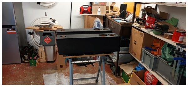 Bei der Farbgebung wollte ich es mir einfach machen und hab mich nach mehreren Youtube-Videos für das Beizen entschieden. Zuerst mit 80er Körnung grob geschliffen (der übrige Leim muss weg), dann 180er und am Ende 240er. Das Ganze hab ich zweimal in schwarz gebeizt (mit Pinsel 60mm) und am Ende nur einmal mit Klarlack (mit Roller) versiegelt. Ich habe dabei immer darauf geachtet, dass ich großflächig und gleichmäßig gestrichen habe. Also zuerst Farbe/ Lack drauf und solange alles noch feucht ist, gleichmäßig über die ganze Fläche nochmal drüber streichen/ rollen. Eigentlich wollte ich 2 bis 3 mal Klarlack auftragen mit immer wieder einem Zwischenschliff. Das Ergebnis nach dem ersten Klarlack gefiel mir aber so gut, dass ich dabei blieb. Außerdem konnte ich endlich alles fertig zusammenbauen und probehören.