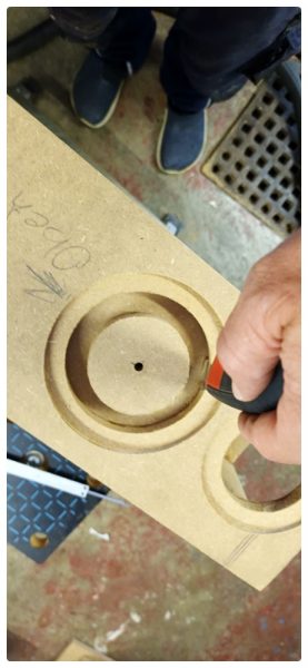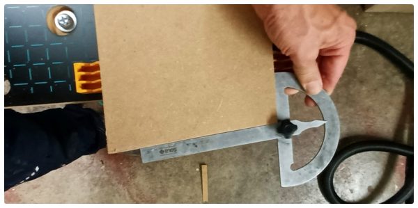 Jetzt noch das ganze 5° schräg. Ähm ja, wie mach ich das eigentlich? Hier fingen die Probleme an. Wer es sich ersparen will, wie ich drei Gehäuse zu bauen, sollte vielleicht zuerst die Box laut Plan bauen, außer man ist begabter als ich. Ich neige nunmal dazu, etwas verkopft zu sein. Das führt dazu, dass ich zuerst zu viel und bei der Ausführung zu wenig nachdenke. Da die Preise für MDF normal aber niemandem in den Privatkonkurs treiben (ich zahlte ca.12 Euro für den Zuschnitt pro Gehäuse), ist auch das verkraftbar. Mit Handkreissäge , Multischleifer und Oberfräse ausgerüstet, einfach mal drauf los gebaut.