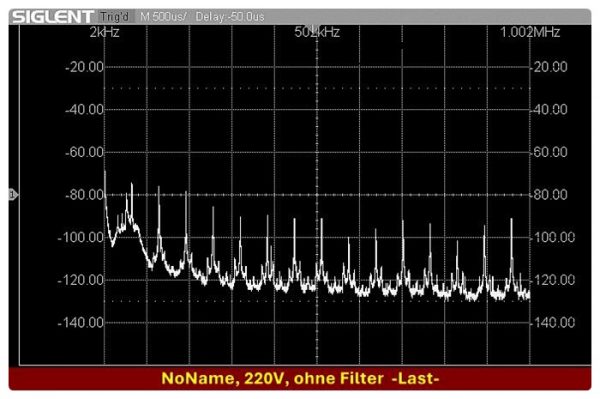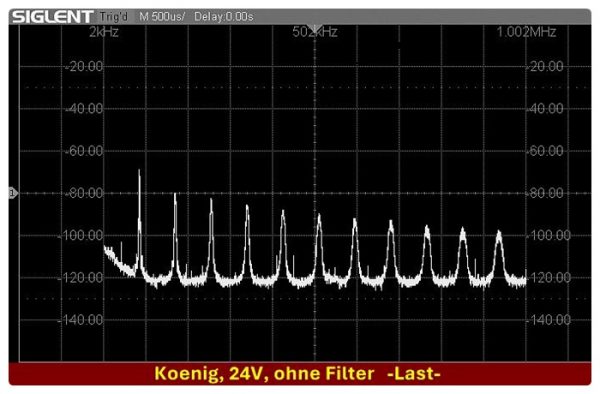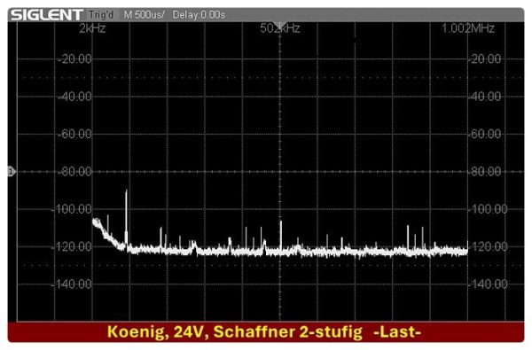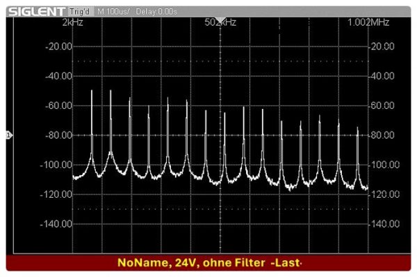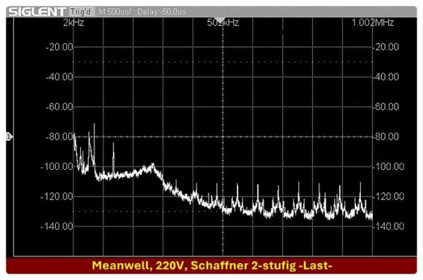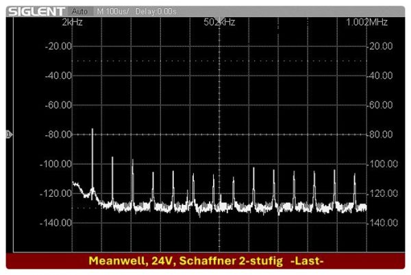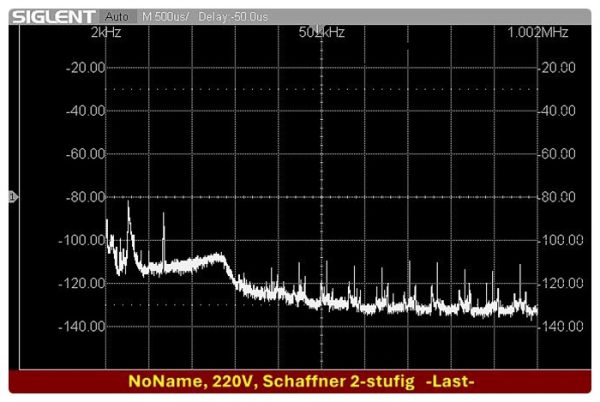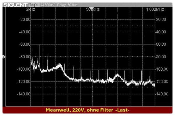 Diskussion: Ein schöner Vergleich mit dem Meanwell, ein ähnliches Spektrum, der positive Einfluss des zusätzlichen Filters ist wiederum klar erkennbar.