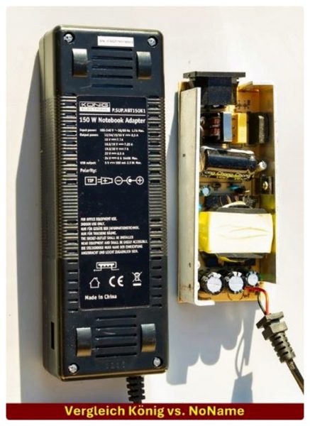 Hier stimmt etwas nicht. Günter, DL4ZAO hat in [3] ausführlich über solche Ausreißer referiert. Das Plastikgehäuse vom NoName Netzteil ist verklebt. Ich säge es auf, mit einer Metallbügelsäge sind die Klebenähte schnell getrennt. Zunächst einmal die Vergleichsansicht, König vs. NoName:
