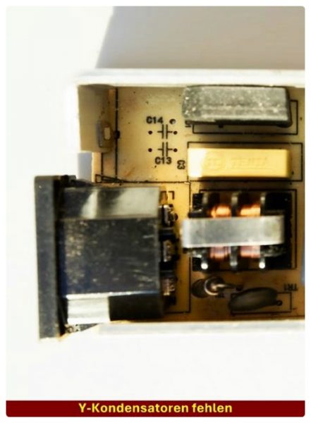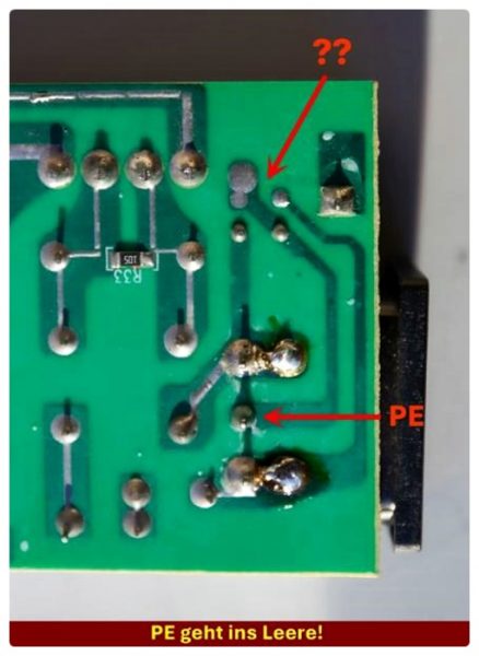 Diskussion: Das ist unfassbar. Ein Produkt mit einem CE-Zeichen, aber der PE-Leiter hängt in der Luft. Die Entstör-Maßnahmen sind nicht bestückt, es ist leider kein Einzelfall wie auch in [3] berichtet.