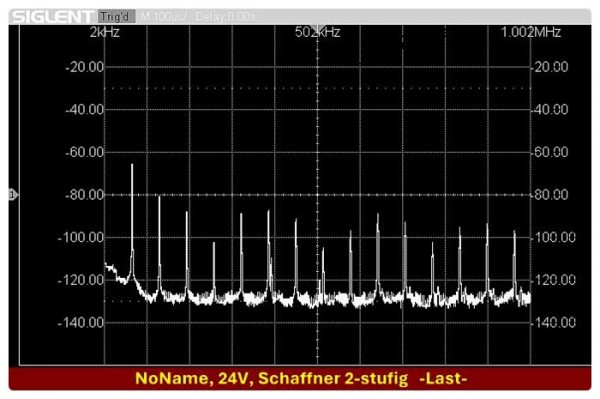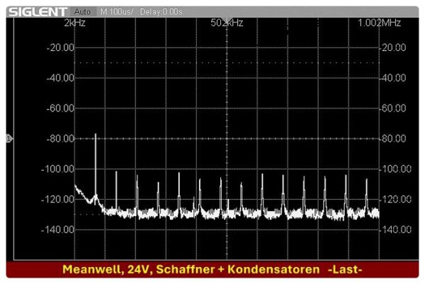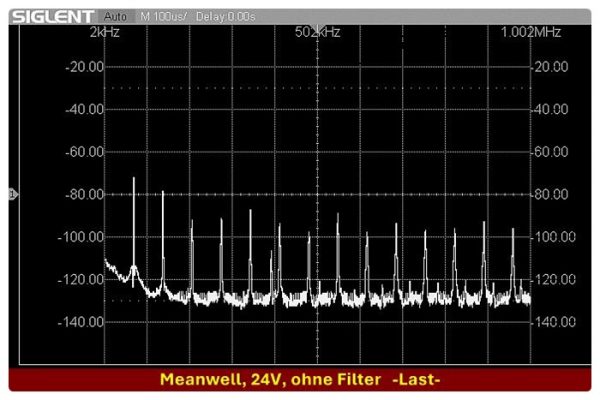 Diskussion: Im Meanwell sind mustergültige Filterbauelemente gemäß [3] S.10, 43 verbaut. Trotzdem ist ein deutliches Oberwellenstörspektrum zu erkennen, die ersten Vielfachen liegen bei 40 dB (100 fache) und 60 dB (1000 fache) über dem Grundrauschen. Mit dem zusätzlichen Filter ist eine Dämpfung von 10…20 dB zu ersichtlich.