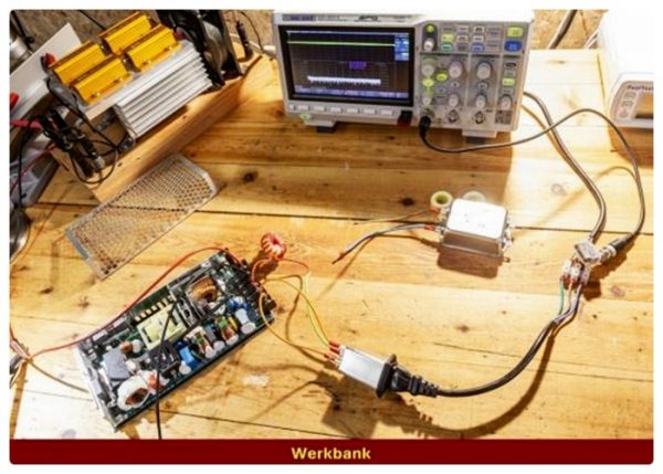 In [1] S. 3,16 und [2] S. 8,9 wird zwischen zwei Arten von Störungen differenziert, es sind die Gleich- und Gegentaktstörungen. Beide müssen selbstverständlich minimiert werden, die vorgenannten Kollegen sind allerdings zu der Erkenntnis gekommen, dass kaum Gleichtaktstörungen auftreten, es geht hauptsächlich um die Gegentaktstörungen [1] S.16, 18, 19, 28 ff. und [2] S.13 ff. Hier einmal ein Werkbank-Foto ganz zu Beginn.