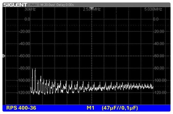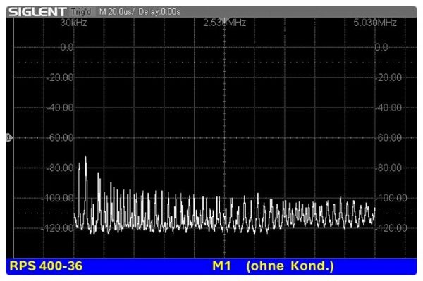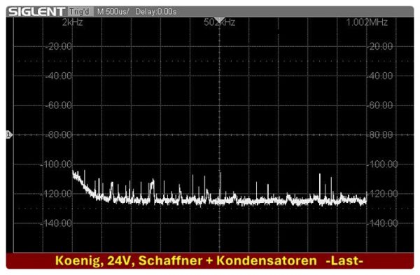 Diskussion: Die Parallelschaltung der vom Hersteller empfohlenen beiden Kondensatoren direkt am Netzteil bewirkt einen Abfall der Oberwellenamplituden insbesondere ab 1,5 MHz aufwärts, unter 1 MHz passiert noch nichts Gravierendes.